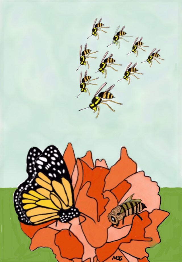 Per tutta risposta Maya lanciò un messaggio alla vespa dicendole di smettere di fare la gradassa perché le sue picchiate avevamo spaventato la farfalla, sua grande amica. La vespa rispose come un pilota d’aereo “Ok, ricevuto, abbandono” e scomparve rapidamente dalla loro vista.