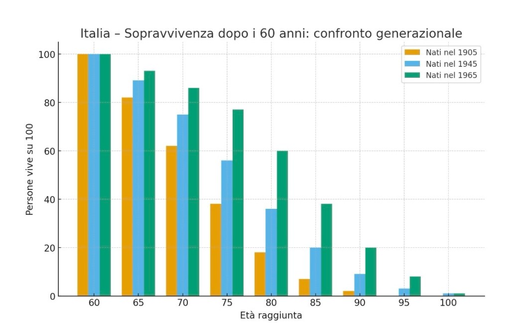 Il grafico pone dunque una questione centrale: non solo quanto a lungo viviamo, ma anche come invecchiamo. Le istituzioni sociali, il welfare e i modelli di assistenza sono stati costruiti sulla base della struttura demografica dei nati nel 1905, sono stati adattati a quella del 1945, ma risultano sempre meno adeguati alla generazione del 1965. La longevità, da conquista, si trasforma così in una sfida strutturale che riguarda l’intera organizzazione della società.